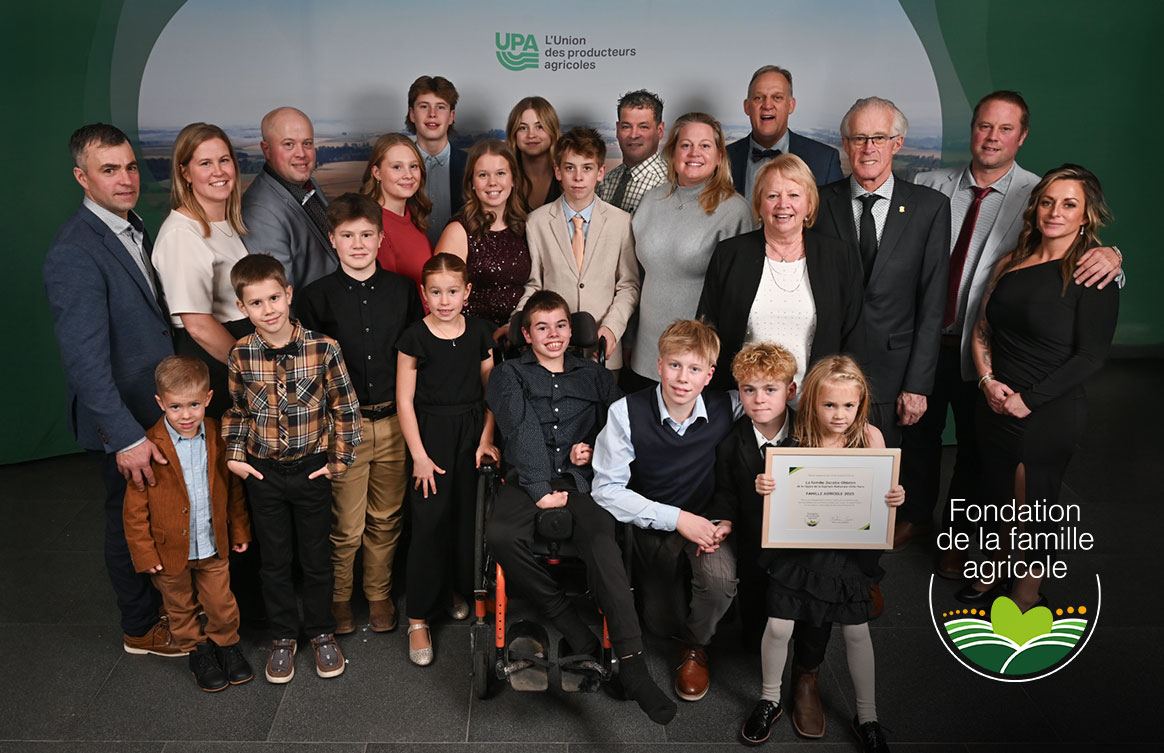 Le Gala de l'Union, où ont été remis les prix, était aussi le moment du dévoilement de la famille agricole 2025, lauréate du concours organisé par la Fondation de la famille agricole. Il s'agit de la Famille Jacobs-Ghielen de Cap-Santé, dans la région de la Capitale-Nationale-Côte-Nord. Une famille aux mille projets, qui voit grand! Une vision, alliée à la passion et à la solidarité, qui prépare la quatrième génération désireuse de poursuivre l’aventure. Félicitations!